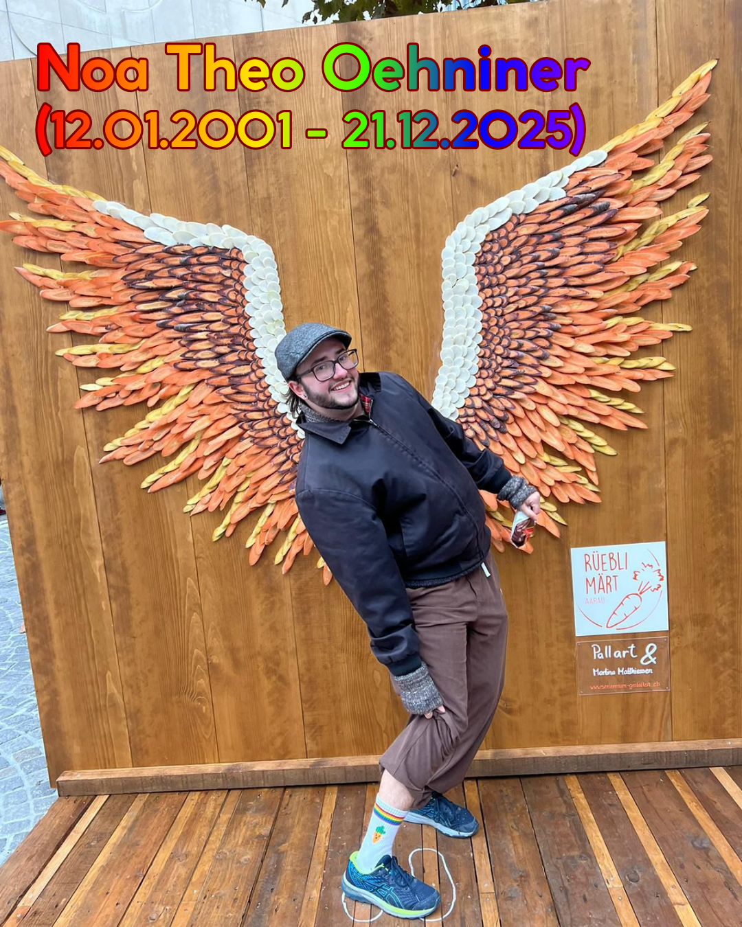 Im letzten Post mussten wir die traurige Nachricht überbringen, dass unser Freund und Präsident von Pride Aargau, Noa, am 21.12.2025 verstorben ist. Er hinterlässt eine grosse Lücke. Der Vorstand und die ganze Community vermissen ihn unglaublich. Mit diesem Nachruf möchten wir ihn in allerbester Erinnerung behalten.